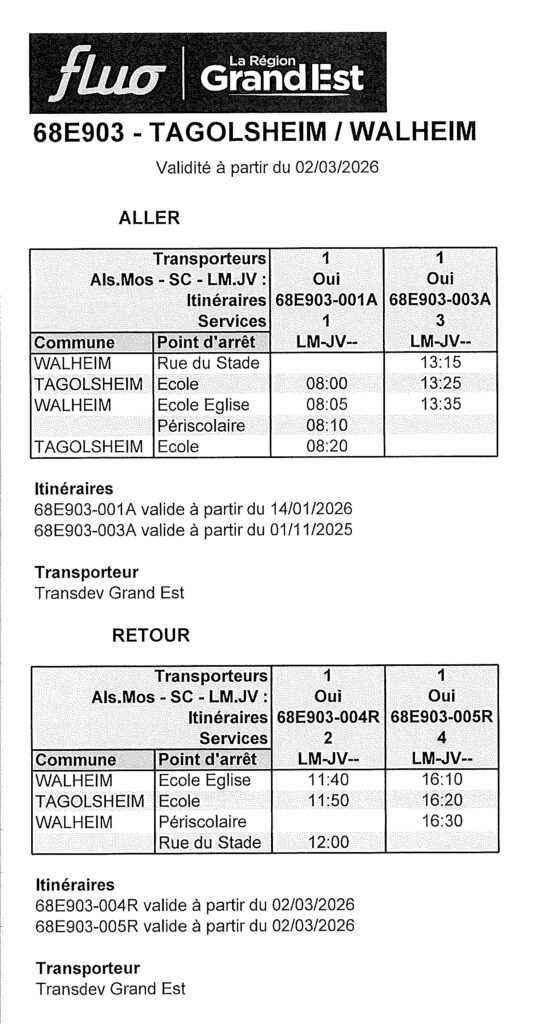 - Tagolsheim école : 7h55