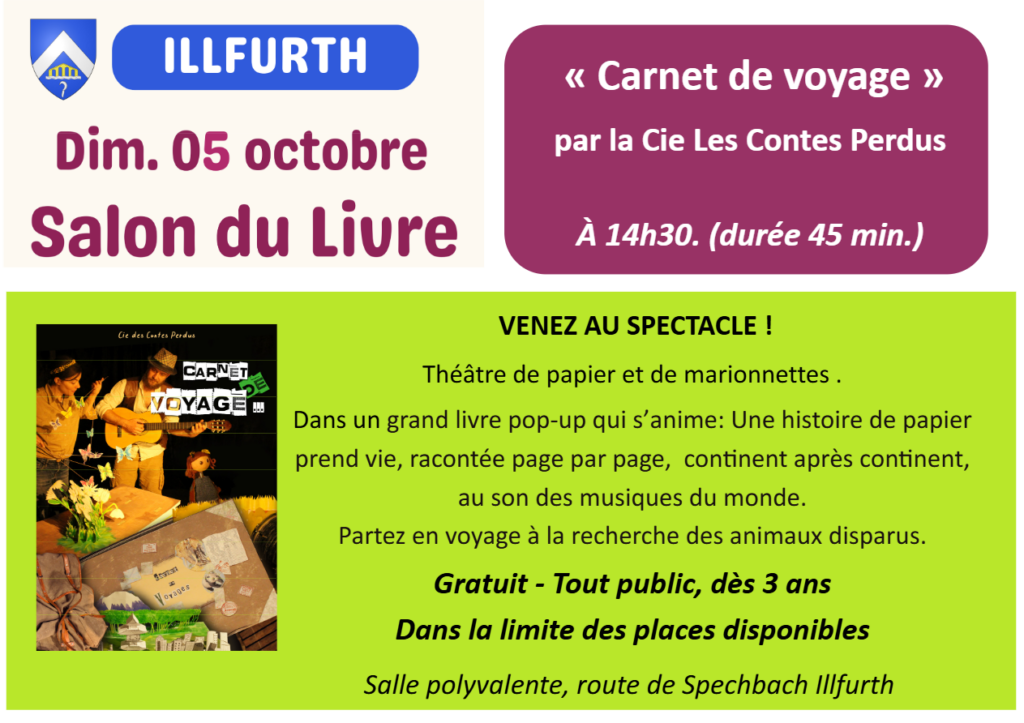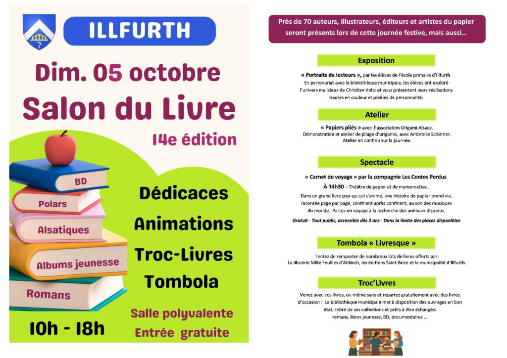 La municipalité et la bibliothèque municipale d’Illfurth organisent le Dimanche 5 Octobre la 14ième édition de son salon du livre.