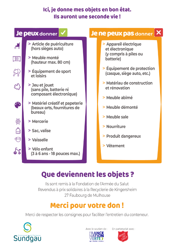 Les dons seront collectés par la Fondation de l’Armée du Salut, puis valorisés à la Recyclerie de Kingersheim, où ils seront revendus à prix solidaires.