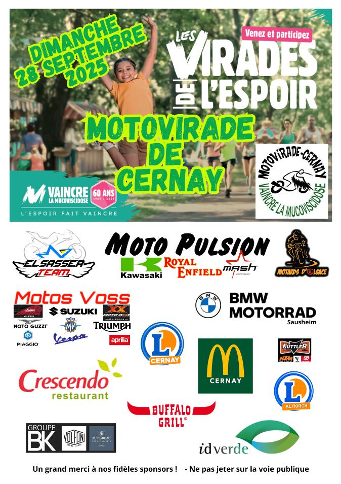 La Motovirade de Cernay va traverser notre commune le dimanche 28 septembre sur la Route Nationale avec le passage de deux convois d’environ 400 motos chacun, espacés de 15 min.
