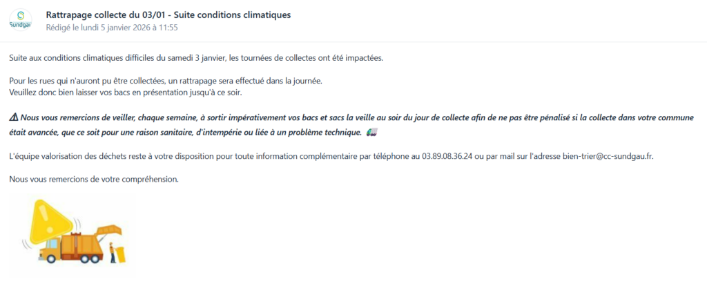 Veuillez donc bien laisser vos bacs en présentation jusqu’à ce soir selon le message ci-dessous du service Valorisation des Déchets :